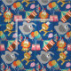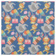 Tecido alegre do circo, brilhante, animador, colorido, divertimento! Caracteriza um fundo dos azuis marinhos com a barraca listrada da tenda de circo, os elefantes cinzentos, os leões que vestem chapéus do partido, os tigres, o algodão doce, as máscaras, e grupos grandes dos balões!