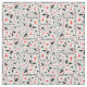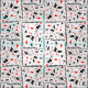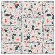 Alice no País das Maravilhas em preto, branco e vermelho em fundo branco. Padrões incluem Alice, Mad Hatter, Coelho Branco, Cheshire Cat, Card Soldiers, relógio de bolso, cartões e rosas.