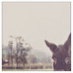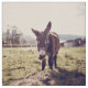 Um asno que come a grama seca onde o campo inteiro é coberto com a grama verde