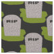 Este tecido artesanato incrível é perfeito para todos os seus projetos de artesanato. A design apresenta uma tombstone de cinza com RIP no texto preto, em forma de gotejamento, sobre um pedaço de grama verde. Ao lado dessa design mórbida, o fundo é preto.
