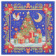 Árvore de Natal decorada bordada por Faux com presentes debaixo da árvore. A árvore está ao ar livre sob uma lua crescente.