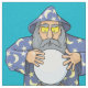 Um velho feiticeiro com capa azul olhando para a bola mágica de cristal.