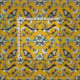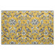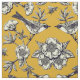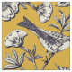 Este tecido de algodão penteado apresenta aves, flores, abelhas e borboletas em azul marinho e creme em fundo amarelo mostarda.