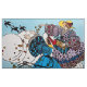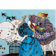 Vibrante, elegante, ilustração de alta moda da Deco de Arte Francesa com lindas senhoras jogando comida às andorinhas no primavera, preto branco, amarelo, azul aqua, verde cores.