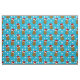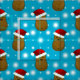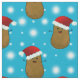 O padrão reproduzido de batatas de Natal castanhas vestindo chapéus de Papai Noel vermelhos com cintas brancas e pompas peludas. Atrás está um fundo azul com flocos de neve brancos cintilantes.