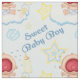 Adorável Menino Bawling sentado em uma nuvem fofinha com garrafa de bebê, pegadas e outros sobre fundo azul pastel e bolinhas branca. Sotaques de estrela divertida. O texto diz "Sweet Baby Boy". Design disponível também na versão da menina.