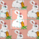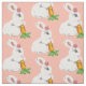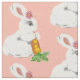 Com um coelho branco pintado doce e sua cenoura colorida, este tecido tem uma sensação de vintagem e feminina, feminina. O coelho parece macio e veste uma margarida rosa perto do ouvido e segura uma cenoura folhada. O plano de fundo é cor-de-rosa-claro. Adorável, tradicional decoração para o berçário de um bebê!