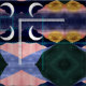 Design de arte da paisagem da lua, moderna, metálica, dourada e prateada, apresentando uma espantosa lua crescente branca e prateada, falso sol metálico dourado, cor rosa e azul escura, gradiente da noite cor azul-rosa e escuro céu com estrelas brancas brilhantes e poeira estelar, montanha verde, montanha rosa, e montanha azul-escura e uma ilustração estonteante do rio azul macio. Arte estética paisagística minimalista do boho.