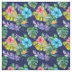 Um lindo e colorido padrão tropical de hibisco azul, flores de hibisco cor-de-rosa e frentes coloridas de samambaia e outras plantas tropicais do Havaí. Todas as plantas estão sobre um fundo azul escuro. Este tecido tropical bonito pareceria excelente em qualquer projeto de artesanato, incluindo cortinas, cobrir de almofada, fazeres de roupas e costura, e muito mais.