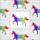 Um Tecido Bonito de Padrões do Rainbow Unicórn Girly. Um unicórnio bonito em cores arco-íris em fundo branco. Um unicórnio desenhado à mão com listras coloridas.