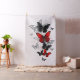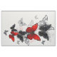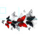 Bando de borboletas voadoras, realistas, vermelhas e pretas em fundo branco com gotas de tinta.