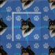Um esboço artístico da cabeça de uma feliz Collie Rough com um fundo azul decorado com estampas e trilhas em tons de cinza, rosa e azul. Design por Diane Blackman. O mesmo design está disponível com outras imagens divertidas de cães.