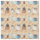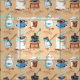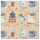 Padrão de café aquoso com um saco de café, um moedor de café, uma xícara de café, um criador de café turco, um pote de café e uma xícara de café para ir.