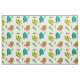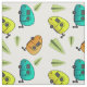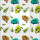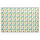 tecido colorido do trailer do campista de reboque com padrão repetido de imagens do trailer do campista, em azul alaranjado, amarelo e azul lacrimogêneo. Acentuado com árvores em forma de folha verde.