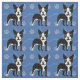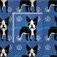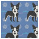 Um estilo divertido de desenho animado Boston Terrier cria uma linda imagem de cachorro para fazer seu coração feliz. O fundo é azul com pegadas e trilhas em rosa, azul e cinza. Design por Diane Blackman.