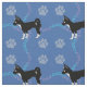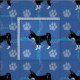 Um lindo cão chihuahua preto e branco com estilo de desenho animado contra fundo azul com estampas e trilhas de pata, rosa e azul