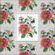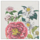 Ilustração botânica antiga de camellias em rosa, vermelho e branco.