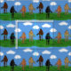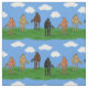 Este tecido com padrão apresenta ilustrações realistas de estilo de cavalos que vão de marrom-claro a preto. Os cavalos ficam sobre erva verde e exuberante contra um fundo do céu azul com nuvens brancas e peludas.