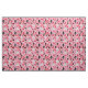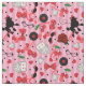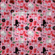 Tecido com padrão rockabilizado, com vintage, na década de 1950, design de poodles pretos, dados, cerejas e óculos escuros sobre notas e listras musicais cor-de-rosa