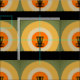 Este design gráfico apresenta anéis coloridos em torno de uma cesta de golfe e grama de disco de silhueta.