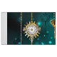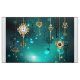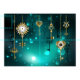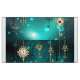Chaves Douradas e antigas com engrenagens e marcadores penduram em correntes douradas sobre fundo verde luminoso.