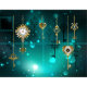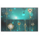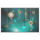Chaves Douradas e antigas com engrenagens e marcadores penduram em correntes douradas sobre fundo verde luminoso.