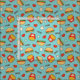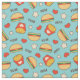 Tecido azul adorável com cheeseburgers, fritadas, corações, e estrelas. Yum!