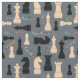 Imagens de silhuetas de chessmen de preto e bege. Palavras coloridas decorativas: xadrez, cheque, xeque-mate, jogo, movimento, campeão, vencedor, pense. Você pode mudar a cor do fundo. Tecido de xadrez engraçado e elegante.