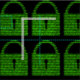 Um cadeado no estilo do computador legal, composto por caracteres de código binário minúsculos. O tema cibernético ou infosec ideal para uma empresa digital ou um entusiasta da computação que terá impacto com seu retrô-verde no preto.