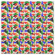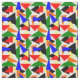 Este tecido tem um design de Bauhaus de uma colagem de triângulos em vermelho, amarelo, laranja, azul e verde.