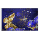 Composição de borboletas luxuosas de safira e joias de ouro em fundo azul texturizado.