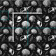 Tecido em conchas e padrões delicados de algas, dispostos sobre fundo preto, criando um contraste impressionante. O trabalho detalhado acrescenta à composição uma sensação intrincada e naturalista.