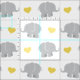 O tecido personalizado apresenta um animal elefante cinza e um padrão cardíaco amarelo brilhante com cor de fundo branca (pode ser modificada).
