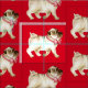 Cãozinho bonitinho caminhando com um colar vermelho de arco e nariz no ar. Diversão repetida cão-vômito com padrão num tecido vermelho de fundo. Pintura a aquarela original e design por Sarah Trett para www,mylittleeden.com