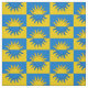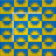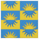 "Per fess azure e ou, um sol trocado." Padrão de amálgama do crachá populacional do Reino de Atenveldt na Sociedade de Anacronismo Criativo.
