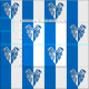 "Per pale azure and argent, um calamário trocou." Avaliar padrão do crachá popular da Barônia de Ruantallan na Sociedade para o Anacronismo Criativo.