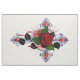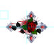 Cruzamento prateado com rosa vermelha e folhas pretas sobre fundo branco.