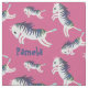 Tecido personalizado do pátio para meninas que amam zebras. Bonito fundo rosa-escuro faz a divertida ilustração de zebra branca pop e faz um belo e divertido padrão. O nome personalizado é impresso em uma sombra azul escura e um estilo de fonte relaxado.