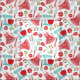 Padrão temático da Vintage apresentando aventais, mixers, utensílios de cozinha e flores em tons de rosa, vermelho e azul. Perfeito para projetos de cozinha de chique.