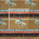 Tecido da equitação do Bronc da sela do vaqueiro do rodeio de Cheyenne. Arena do rodeio com texto de Cheyenne no telhado e em um cavaleiro do bronc da sela. Note por favor que este design tem um olhar textured (veja o fim acima) que esta é parte de uma coleção com eventos diferentes do rodeio com este mesmo fundo da arena do rodeio.