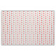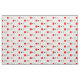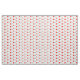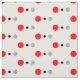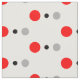 Este tecido tem bolinhas vermelhas, pretas e cinzas.