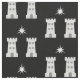 "Sable, duas torres e, em grande parte, uma mullet de três pontos maiores e seis menores, a favor." Avaliar padrão do crachá popular da Barônia de Stargate na Sociedade de Anacronismo Criativo.