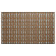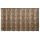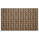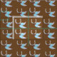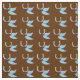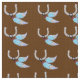 Tecido com um trabalho de arte em forma de fita e penas azuis com fundo castanho.