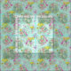 Congelado através de campos de flores com fundo floral verde-claro e verde com placas de cor amarelas, rosa, vermelhas, verdes e brancas para uma montagem de decoração doce.