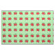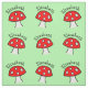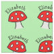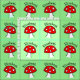 Cogumelos brancos, vermelhos, com um nome acima do boné. O fundo é verde-menta.
