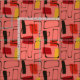 Um design abstrato de arte inspirado no início do século 20 meio século, padrões modernos, com quadrados geométricos deformados a vermelho, laranja e amarelo, sobre um fundo laranja brilhante.