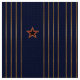 Este tecido apresenta um padrão original do estilo da Deco de Arte Patriótica consiste em 4 conjuntos de fitas verticais douradas de estilo militar duplo alternadas com uma estrela vermelha de 5 pt, revestida com ouro, todas colocadas sobre um fundo de azul marinho escuro rico. Perfeito para qualquer escritório, corredor, biblioteca, caverna-homem, etc.