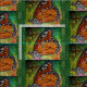 Uma borboleta de monarca cercada por repetições verdes subtis dos designs de texto neste tecido decorativo.
