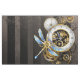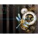 Marcações antigas com engrenagens de ouro e latão, decoradas com libélula mecânica sobre fundo castanho e listrado. Steampunk.