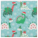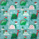 Dinossauros de Natal verdes e brancos, bonitos, com árvore de Natal, presentes, cachecóis, chapéus e flocos de neve sobre fundo azul claro